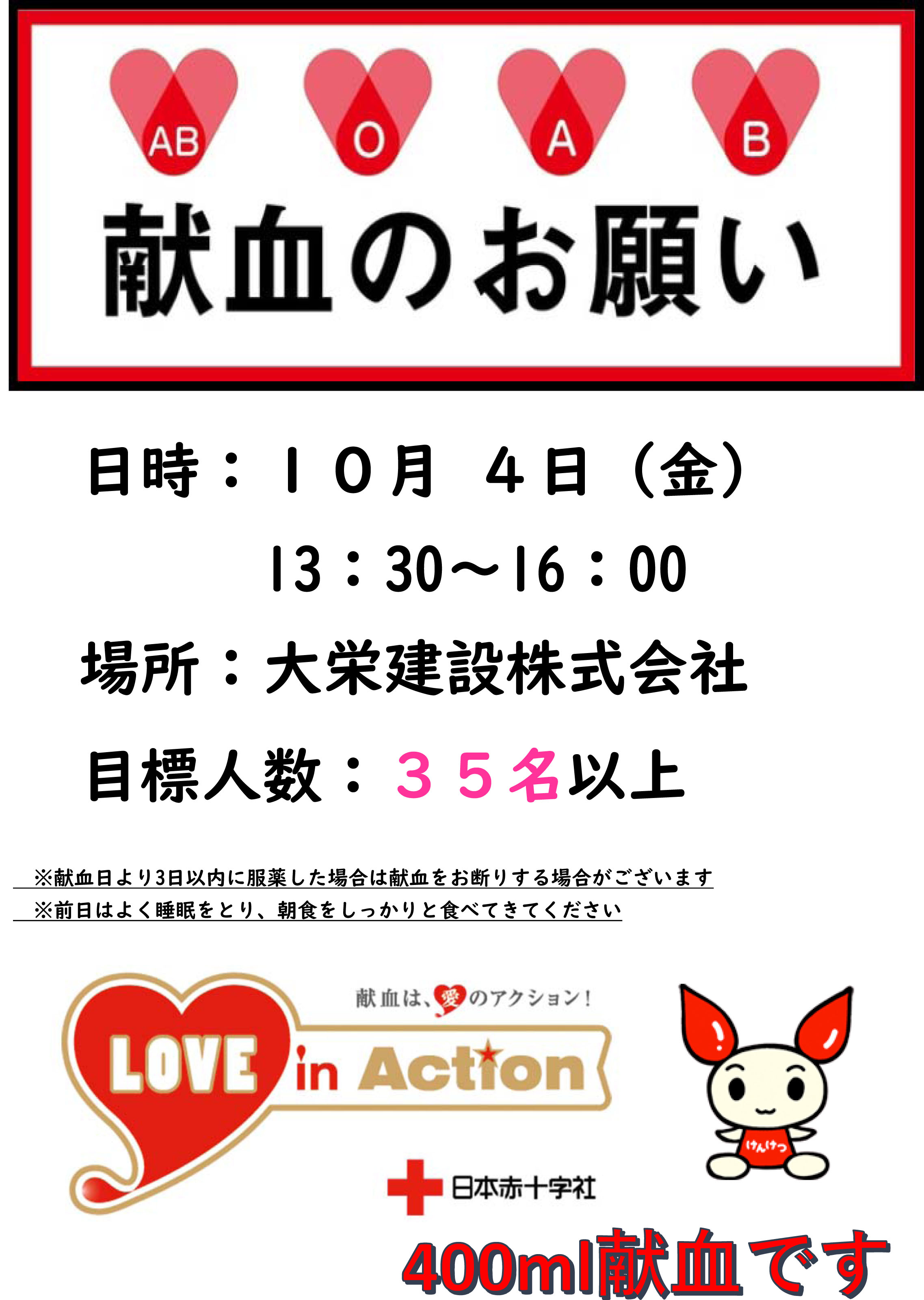 13時半から16時まで、大栄建設に献血車が参ります。