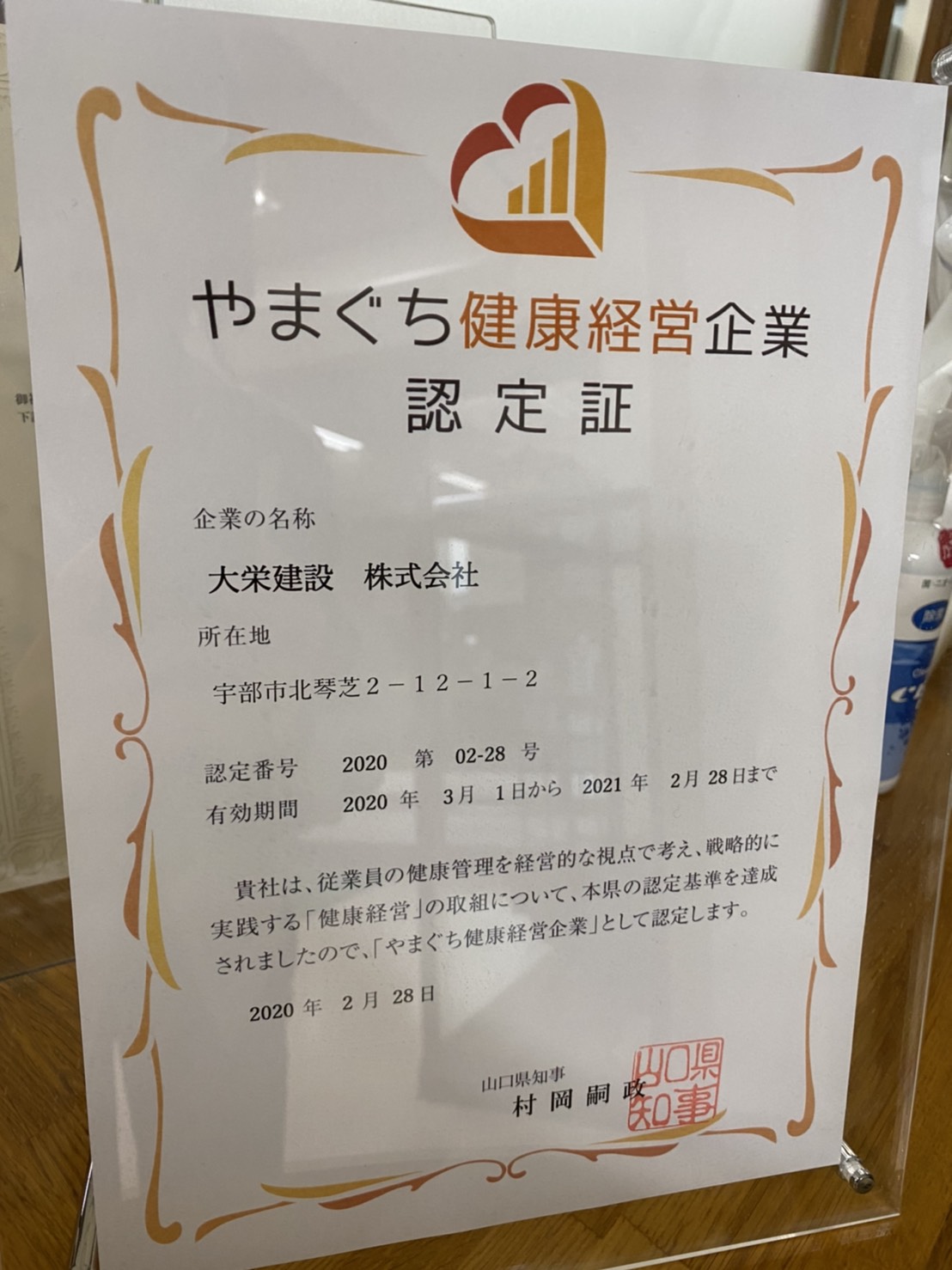 2020年3月1日付けで、『やまぐち健康経営企業』の更新をすることができました。