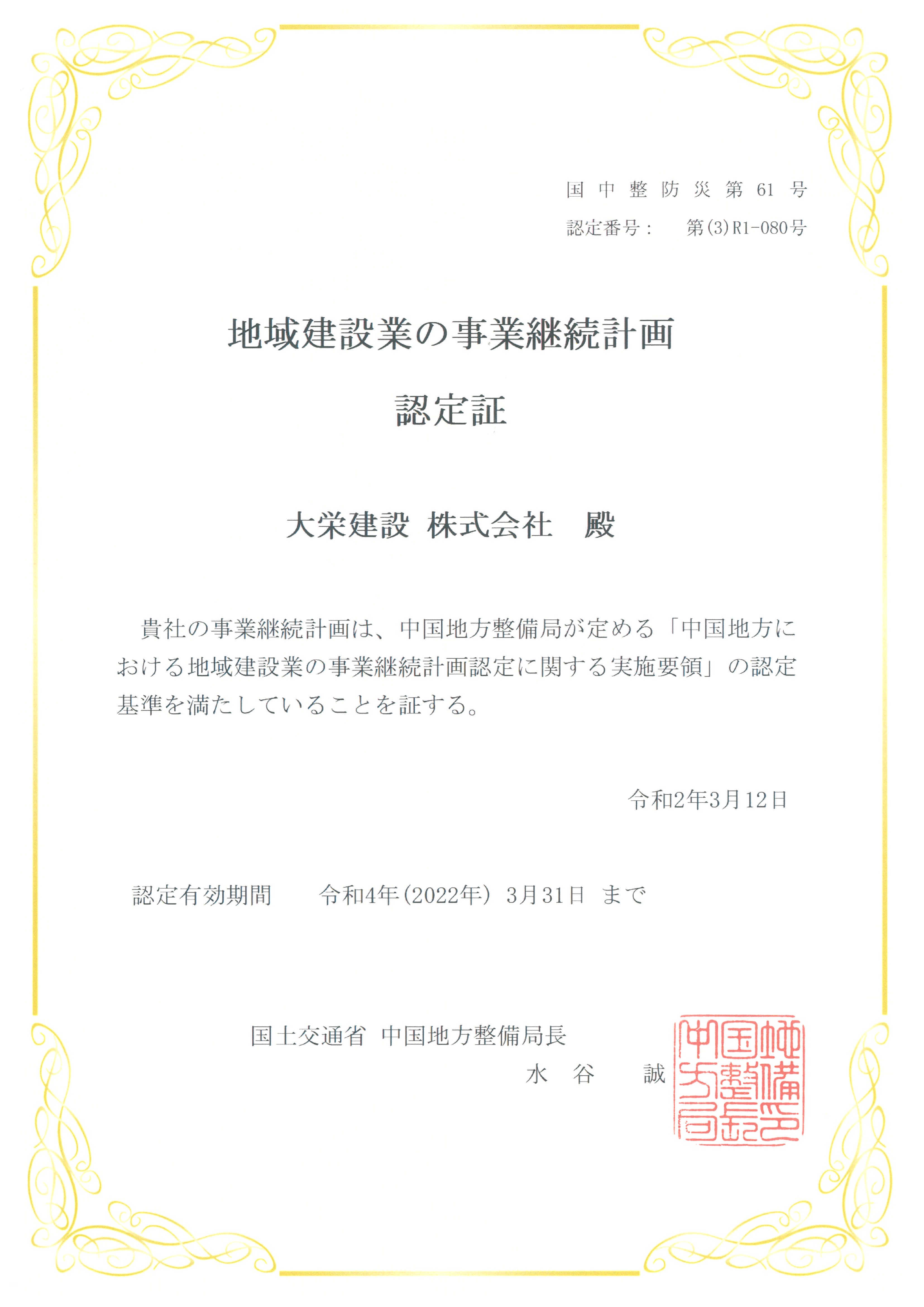 2020年3月12日付けで、地域建設業の事業継続計画(BCP)の継続更新認定を受けました。