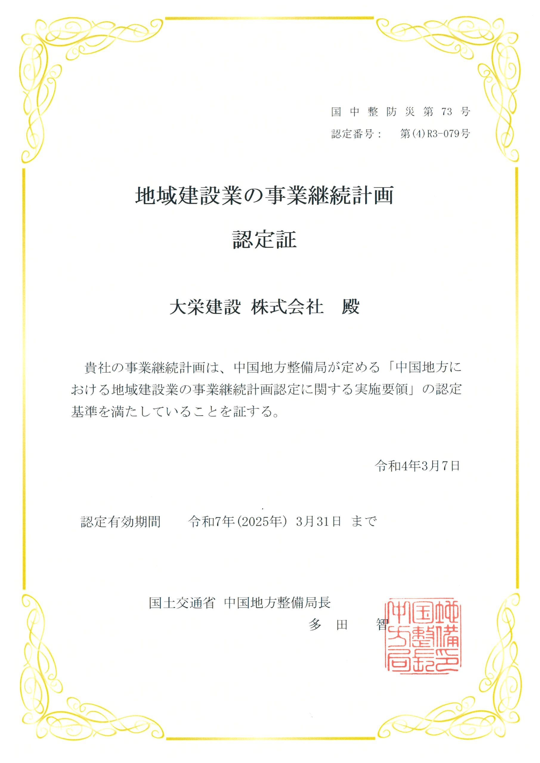 2022年3月7日付けで、地域建設業の事業継続計画(BCP)の継続更新認定を受けました。