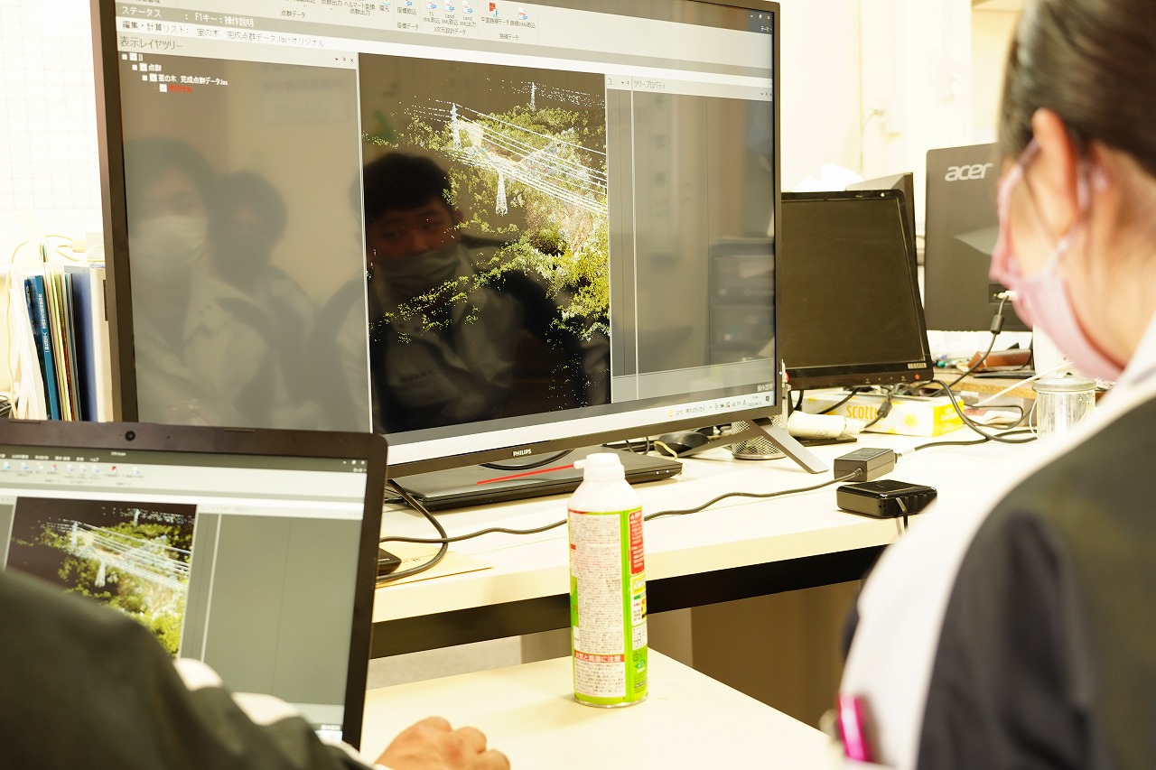 簡単に言うと、レーザーをピーッと対象物に照射して構造物や地形などの形状を3次元データとして取得できる、ということです。