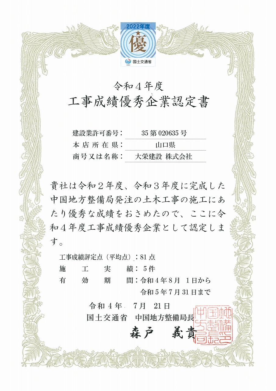 国土交通省 中国地方整備局より、令和4年度『工事成績優秀企業』に認定されました。