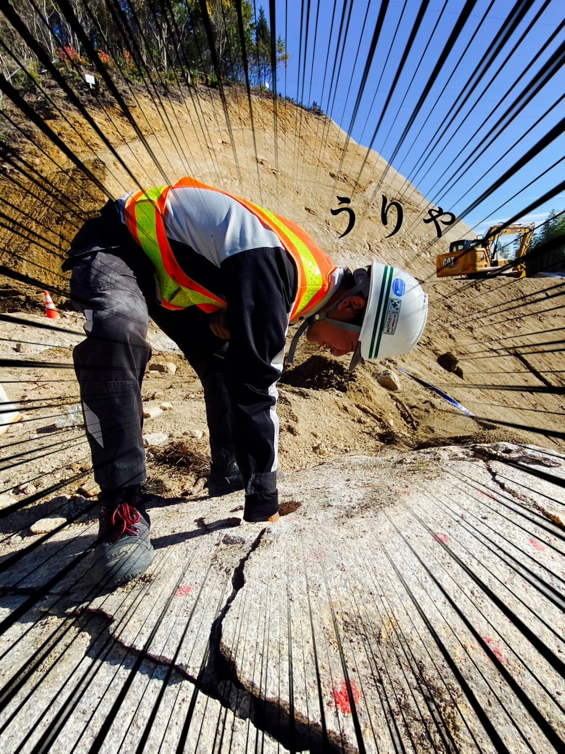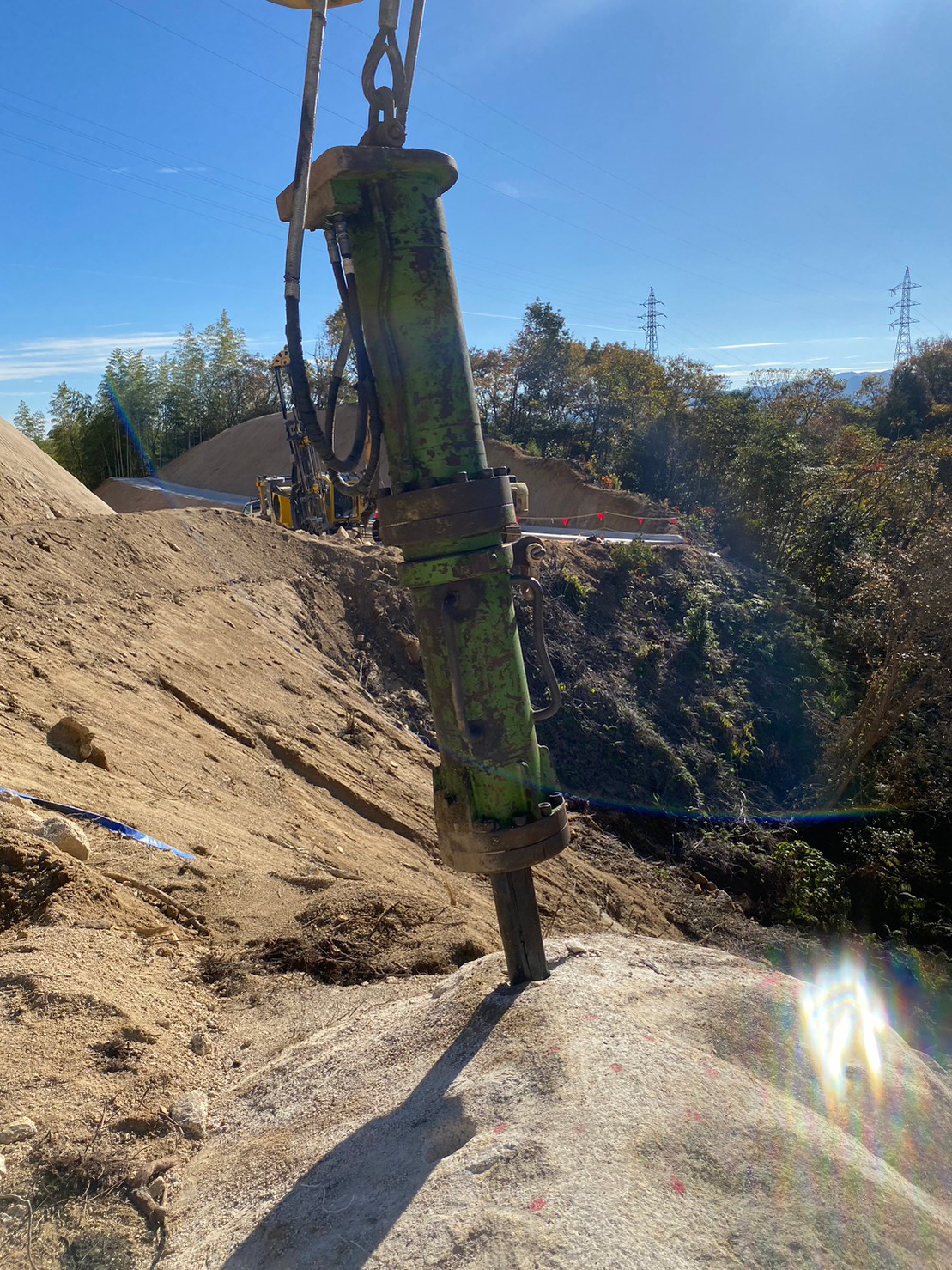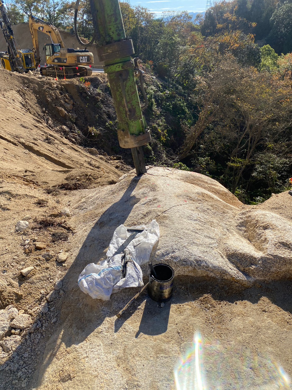 ↑こんな大型ブレーカーでトントンしても少し凹むくらいの固い岩盤。