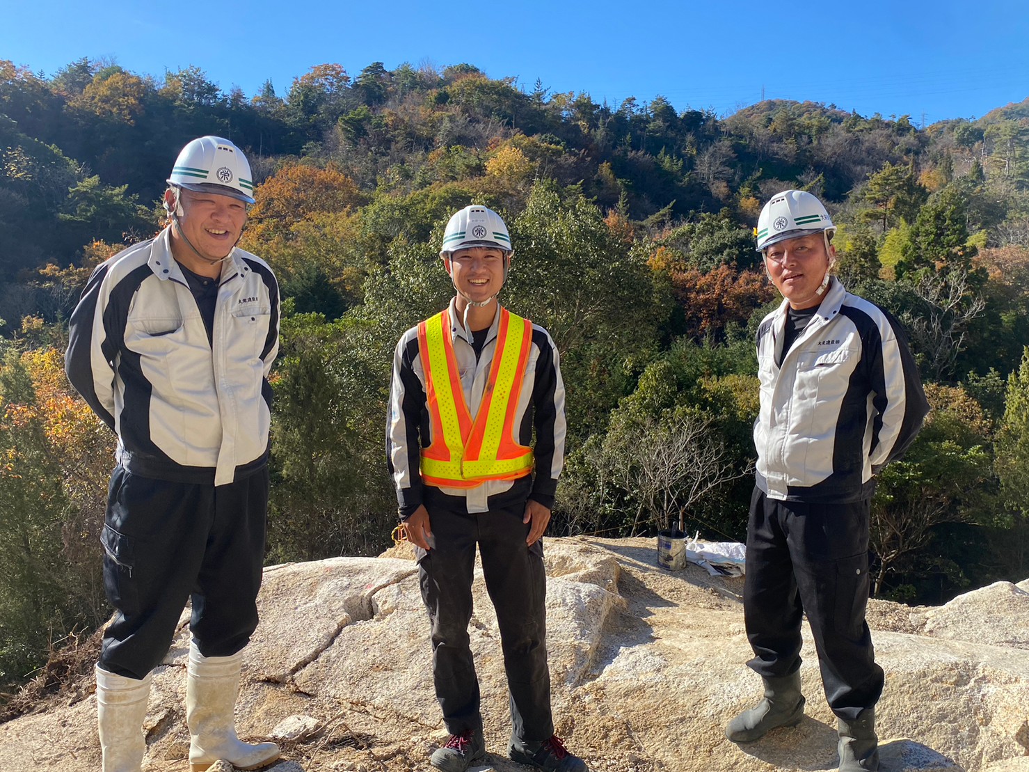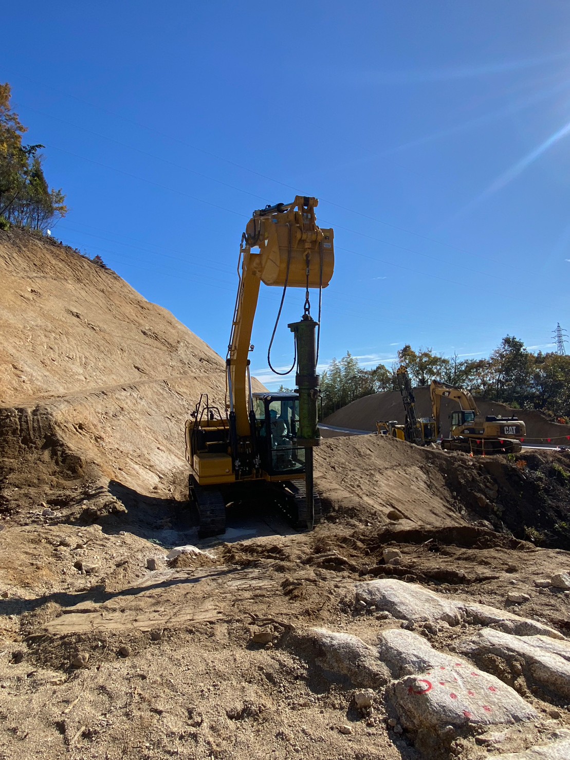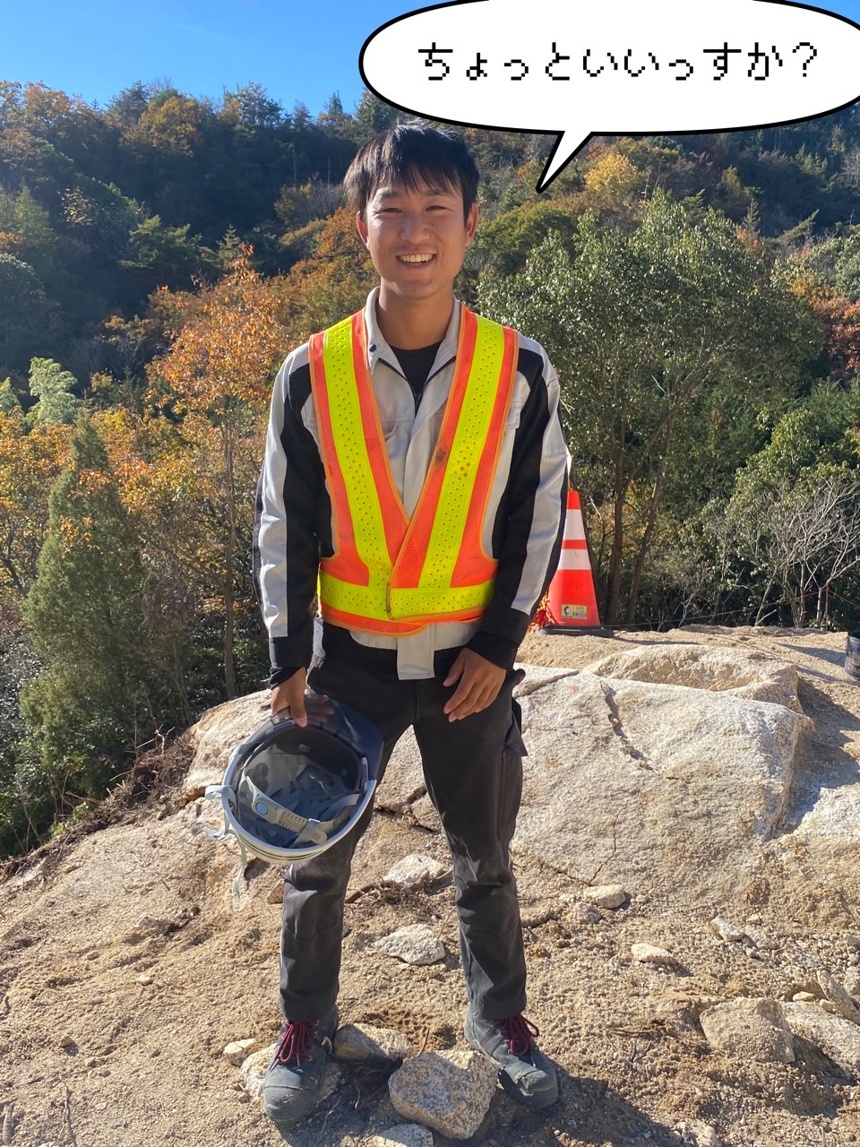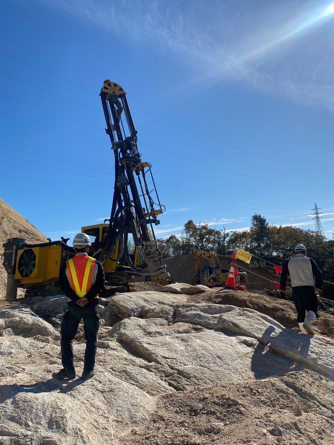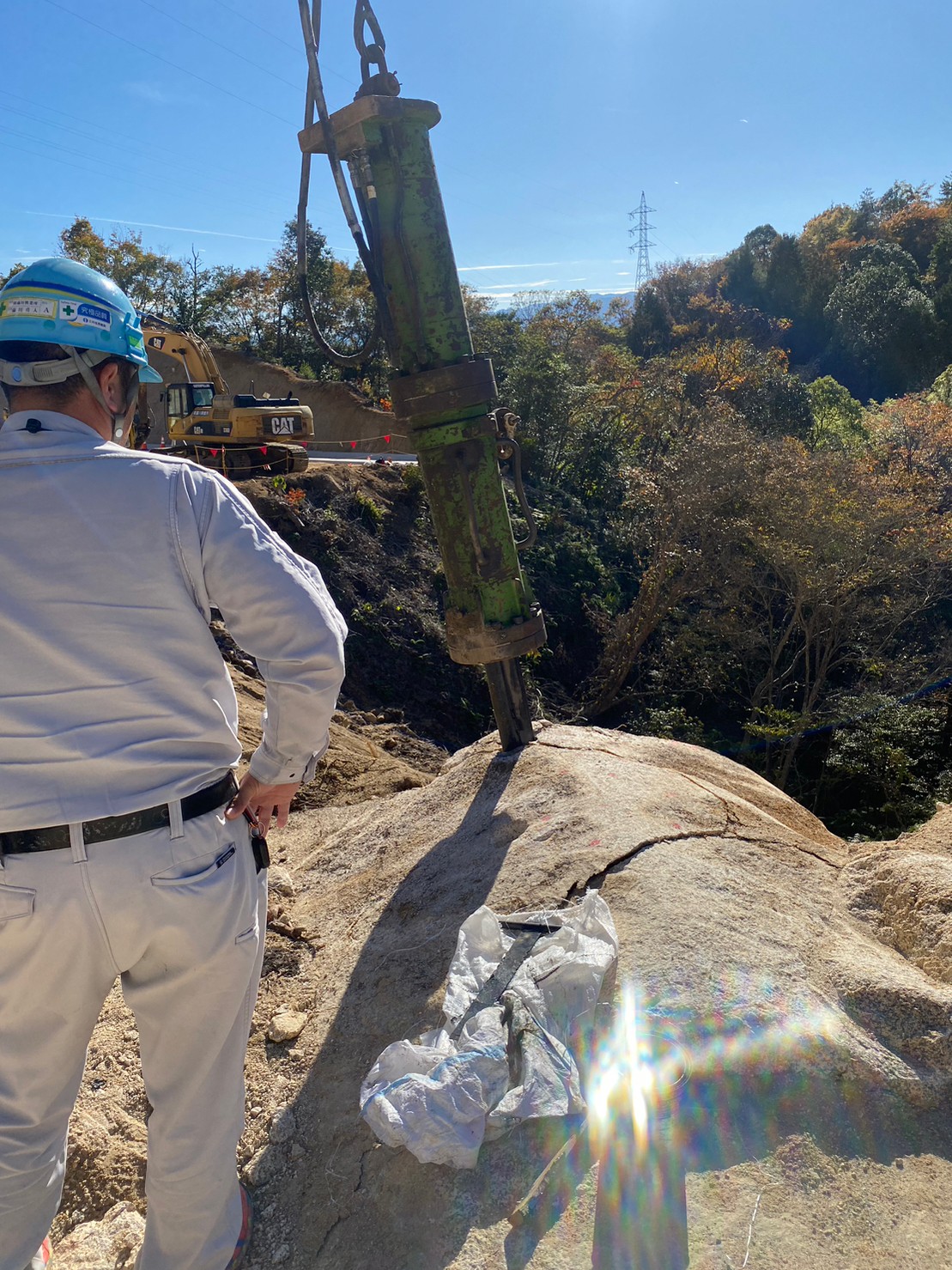 この現場の目的は、山を掘削して道路を作ることなのですが、