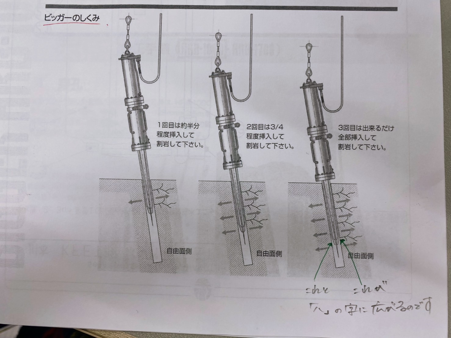 てことで、この説明書通り、穴の中で刃が『ハ』の字にひらくことで、割岩していきます。(゜-゜)