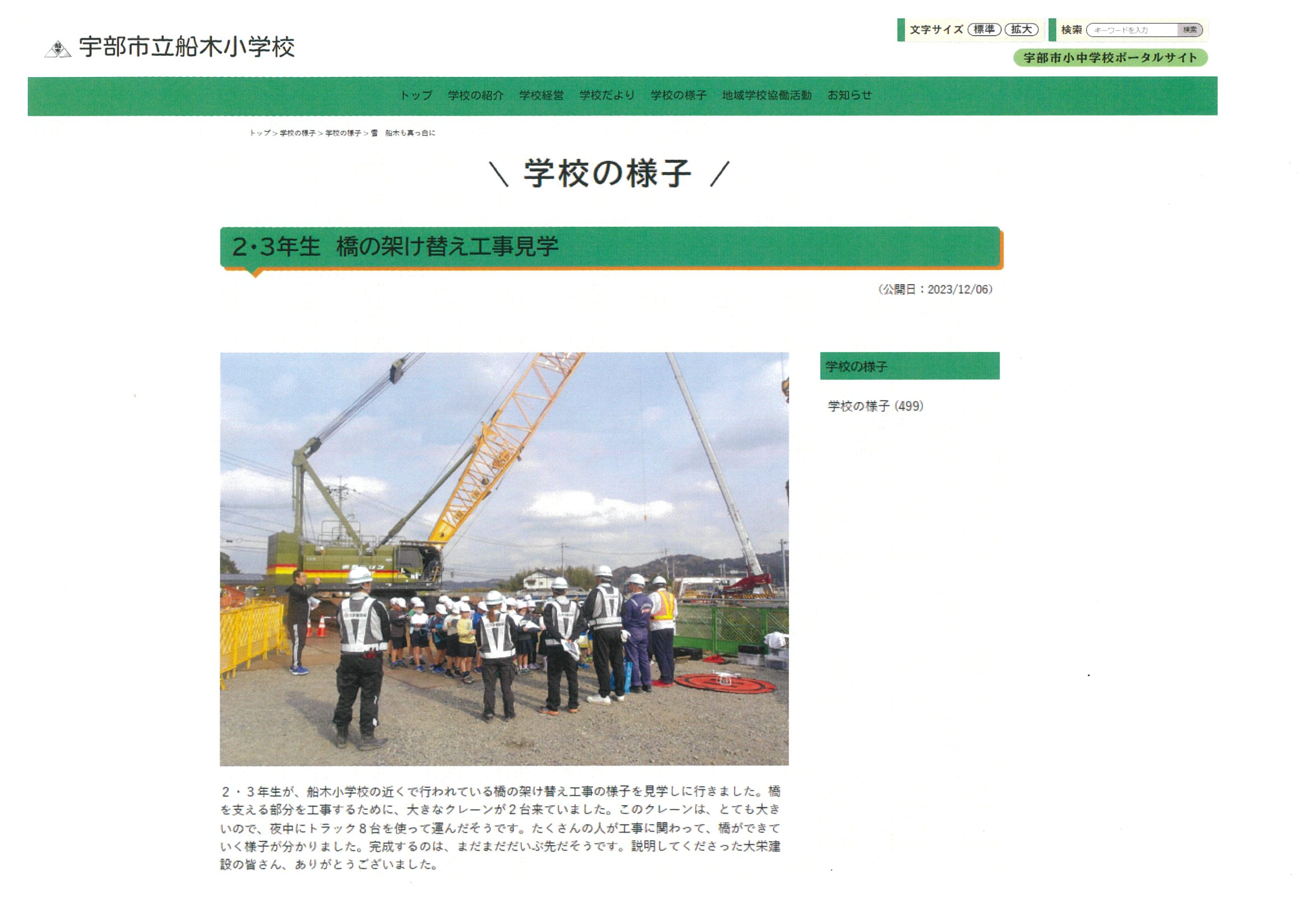 宇部市立船木小学校のホームページに現場見学会の記事が掲載されています。