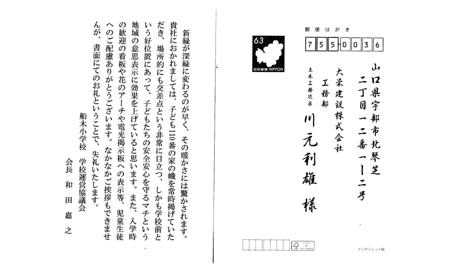 ついには小学校の会長からお礼のおハガキがいただけたんですね。