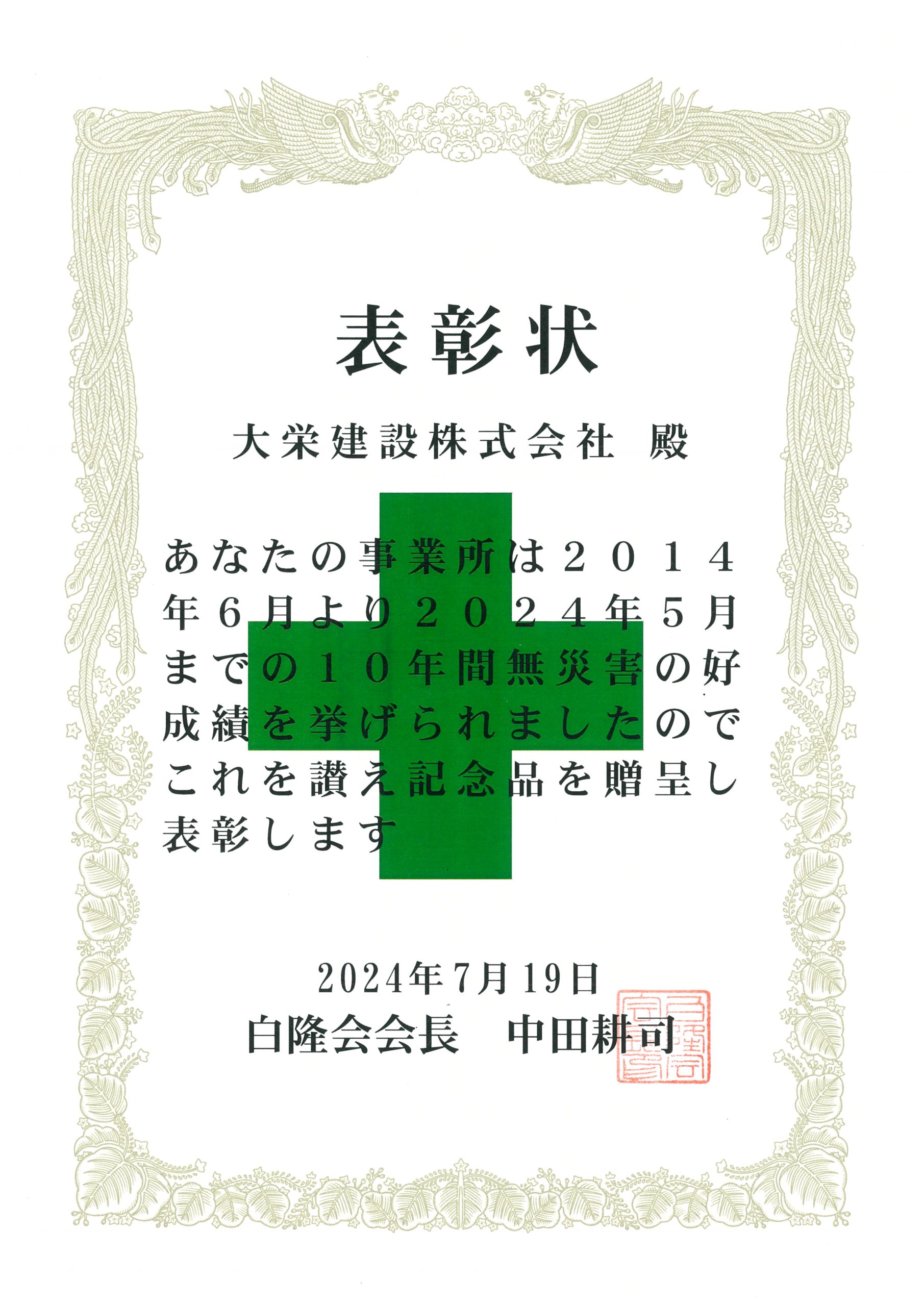 この度、白隆会(チタン工業㈱労働安全協力会)様より『10年間無災害表彰』を頂きました。