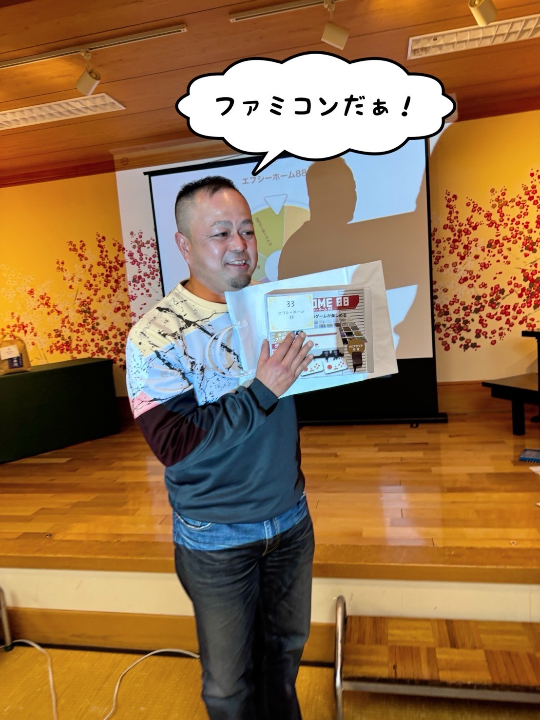 土木工務部の藤川さんが「ビンゴ~!!!」と大きな声で立ち上がり、前に出てきたところからの一連の流れです。