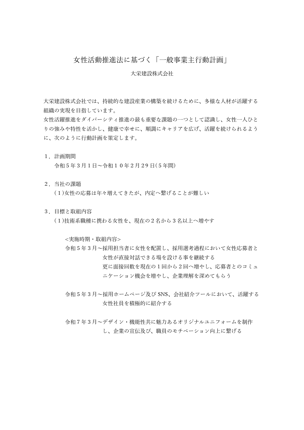 当社では、女性の活躍を推進するため、「女性活躍推進法」に基づき、 次のとおり一般事業主行動計画を策定いたしました。
