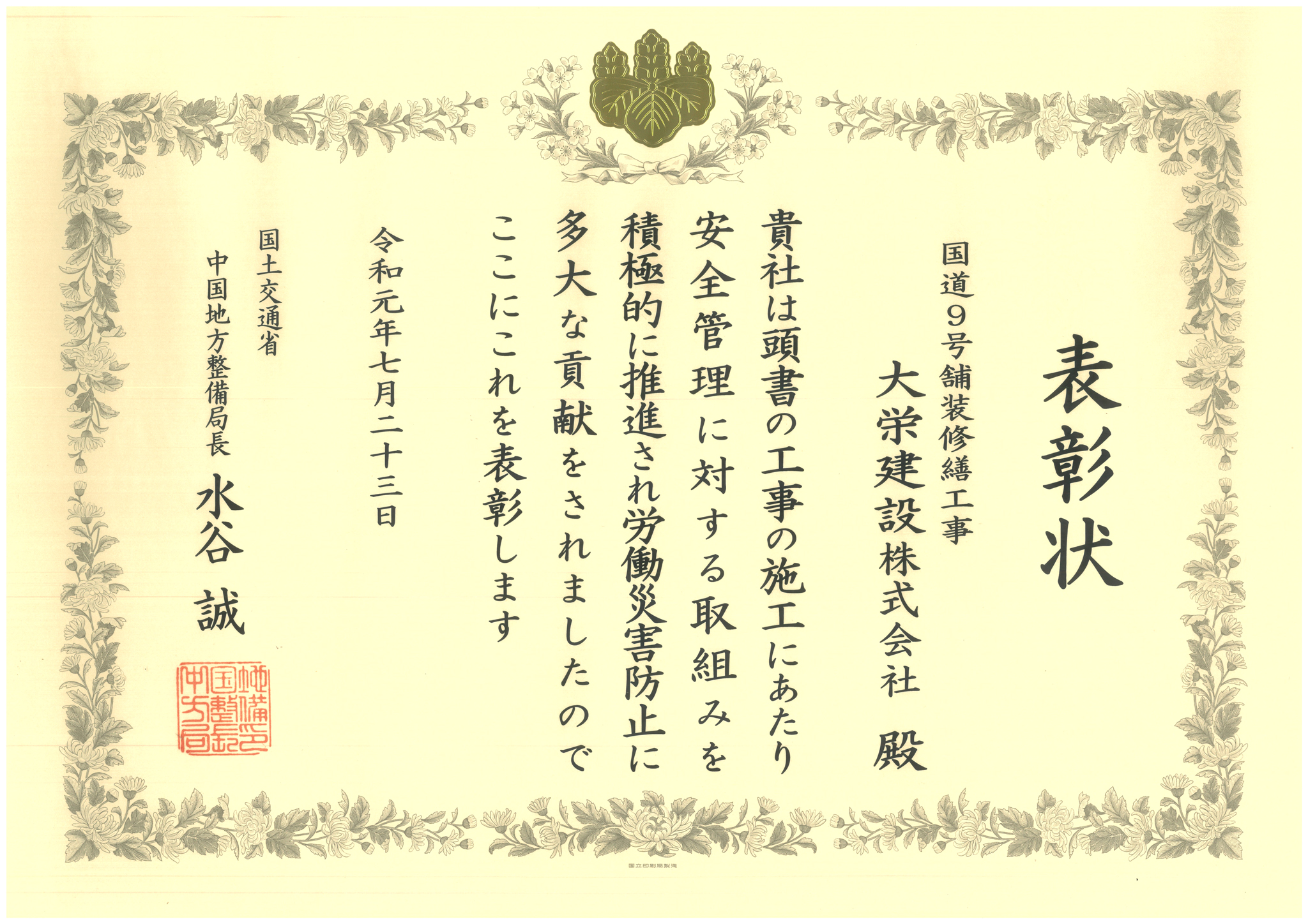 令和元年7月23日 表彰状 国土交通省 中国地方整備局 安全管理優良請負業者