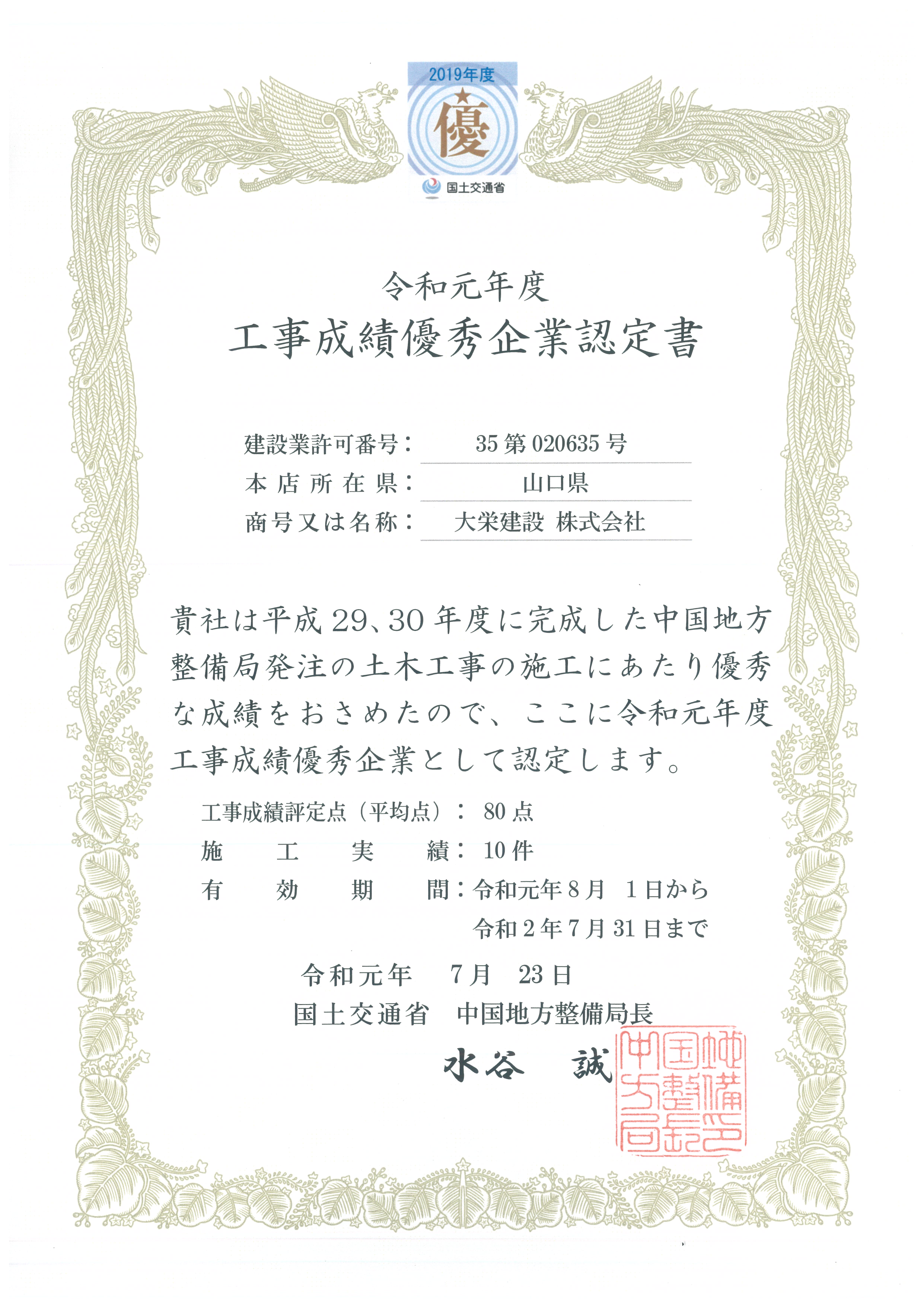 令和元年7月23日 表彰状 国土交通省 中国地方整備局 工事成績優秀企業認定