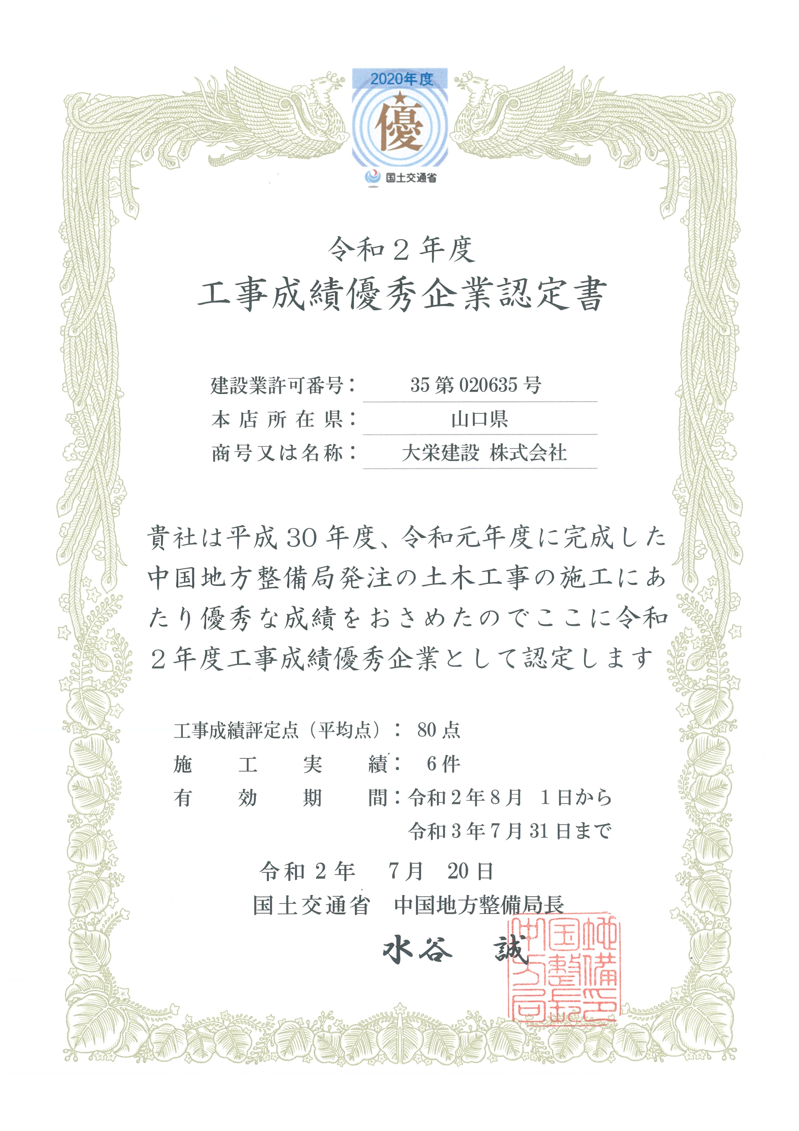 令和2年7月20日 表彰状 国土交通省 中国地方整備局 工事成績優秀企業認定