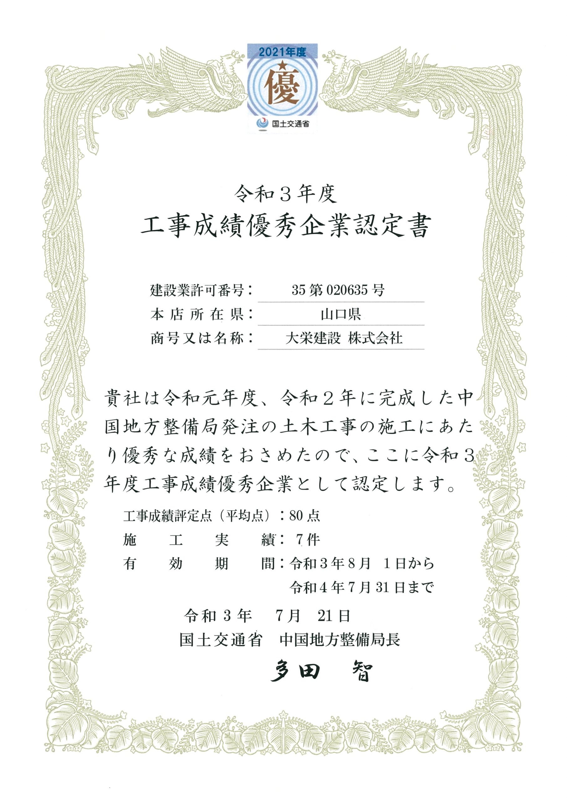 令和3年7月21日 表彰状 国土交通省 中国地方整備局 工事成績優秀企業認定