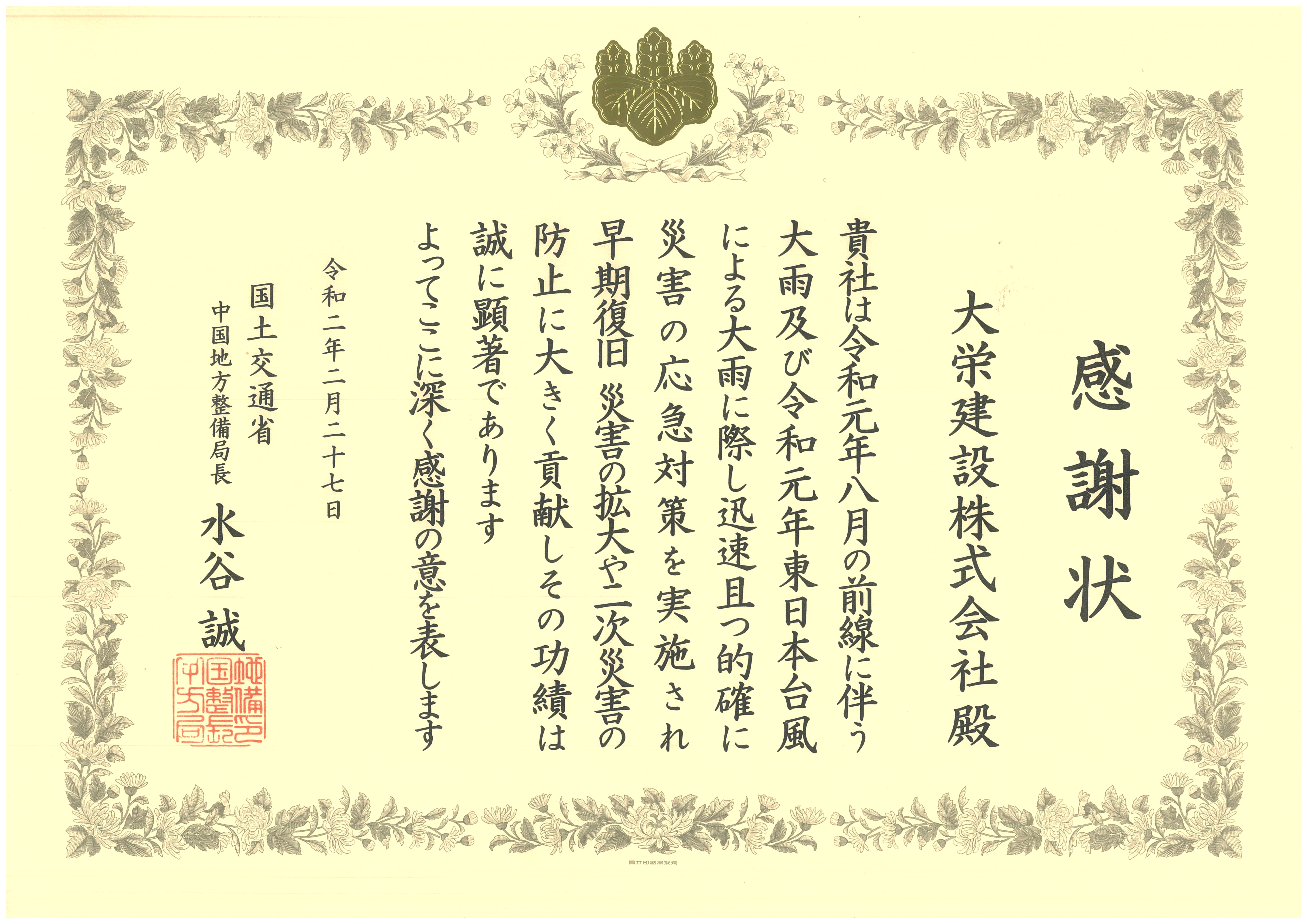 令和2年2月27日 感謝状 国土交通省 中国地方整備局 令和元年度8月の前線に伴う大雨・令和元年度東日本台風による大雨