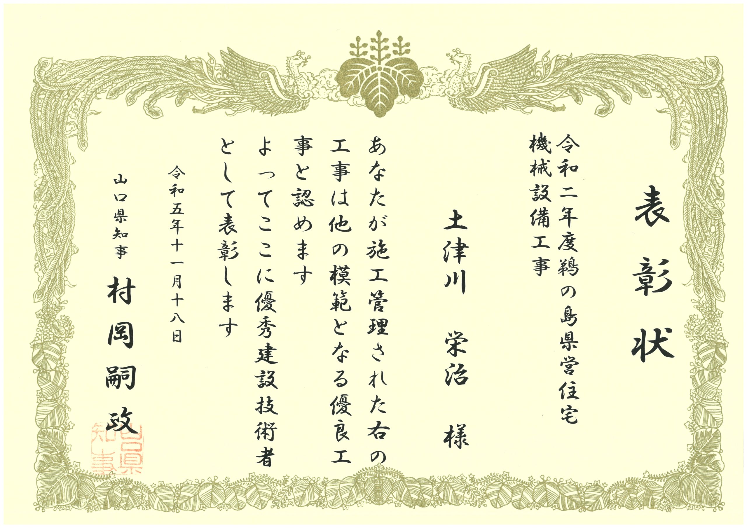 令和5年11月18日 表彰状 山口県優良建設工事(優秀建設技術者)
