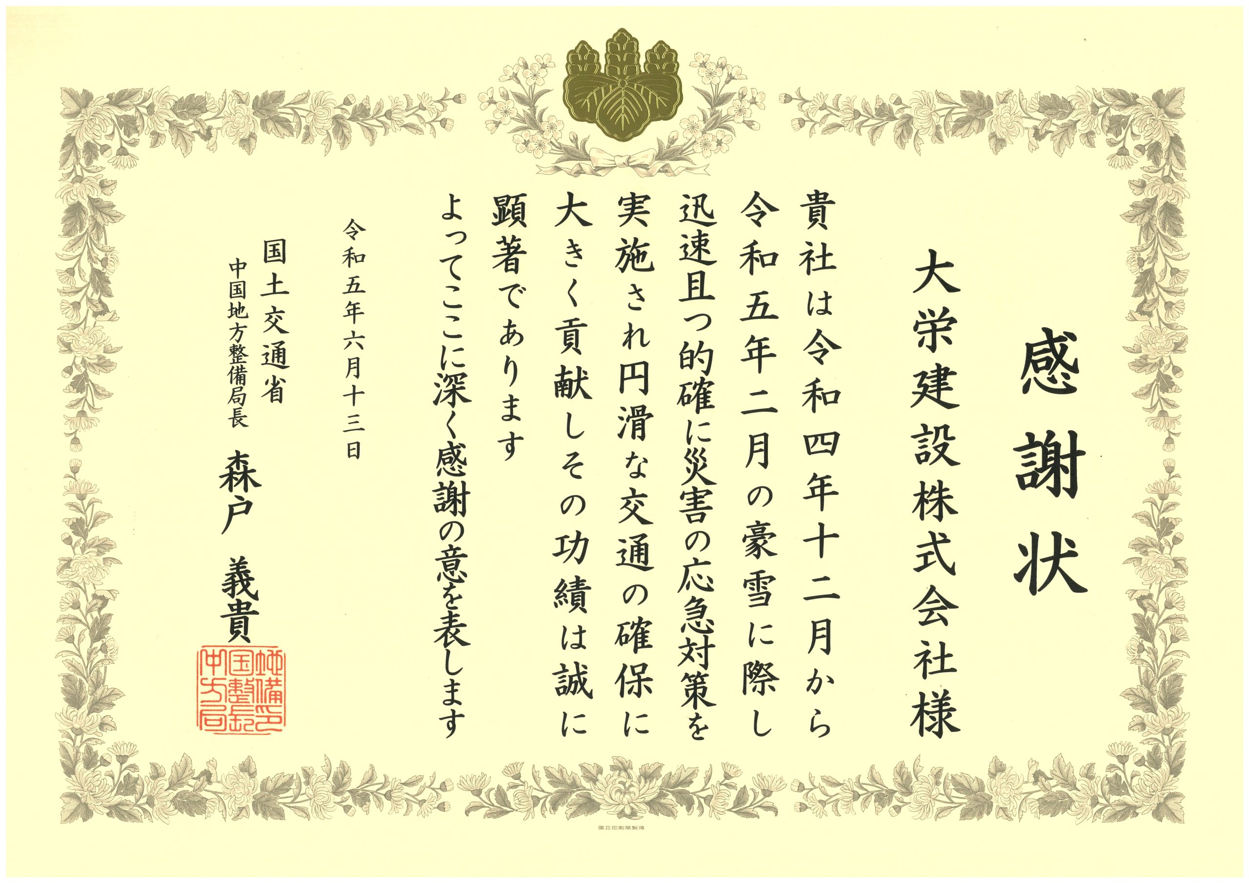 令和5年6月13日 感謝状 国土交通省 中国地方整備局 令和4年12月から令和5年2月の豪雪対応